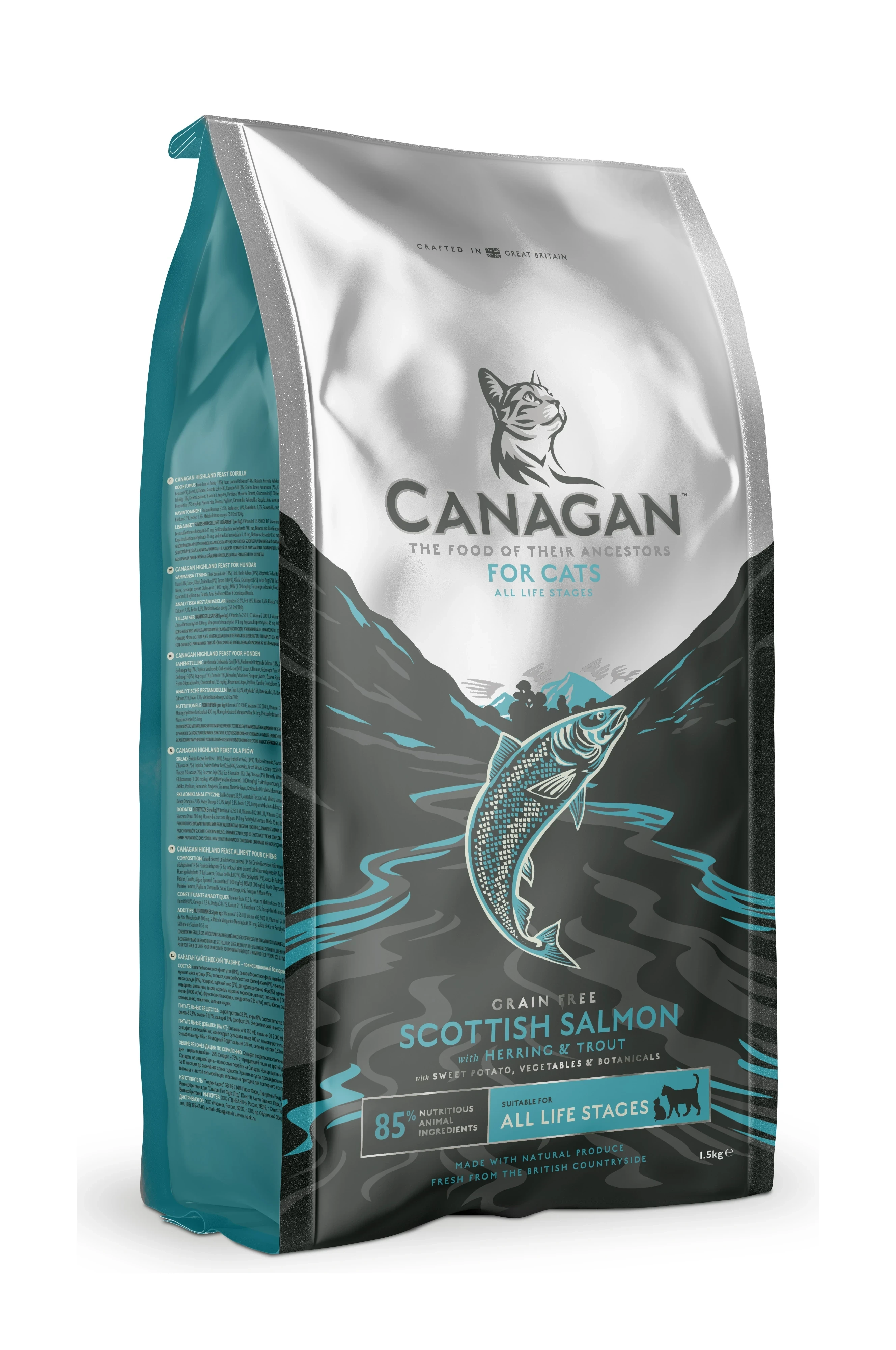 Sucha karma Canagan Scottish Salmon dla kotów zawiera ok 75% ryby, która dostarcza mieszankę pełnowartościowego i bardzo dobrze przyswajalnego białka. Karma jest przygotowana według standardów i wymogów produkcyjnych spełniających te same wymogi co żywność dla ludzi. Łosoś jest wzbogacony o śledzie, pstrągi oraz mięso z białych ryb, tworząc zestaw wysokiej jakości - idealny nawet dla najbardziej wybrednych pociech.