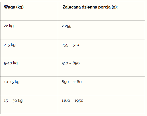 Dzienną porcję należy dostosowywać do trybu życia wieku i aktywności zwierzęcia.